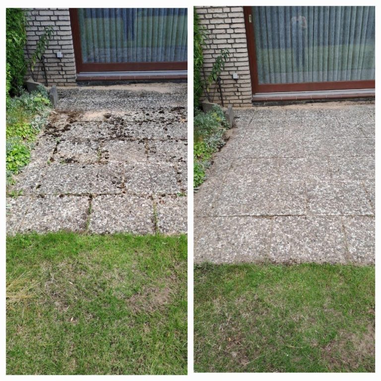 Gehweg und Terrassenreinigung mit Krautentfernung aus den Fugen und milder Bürstenreinigung